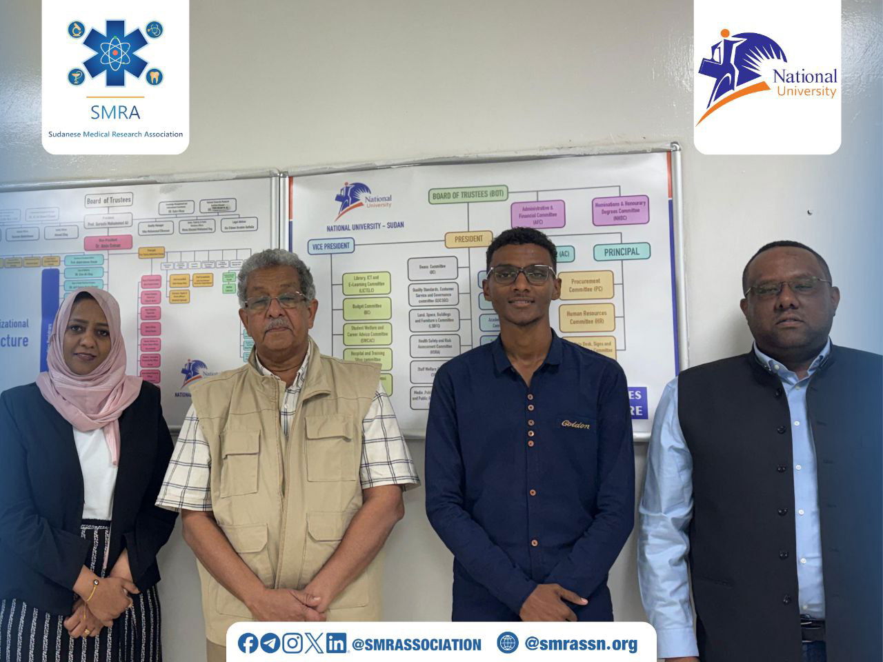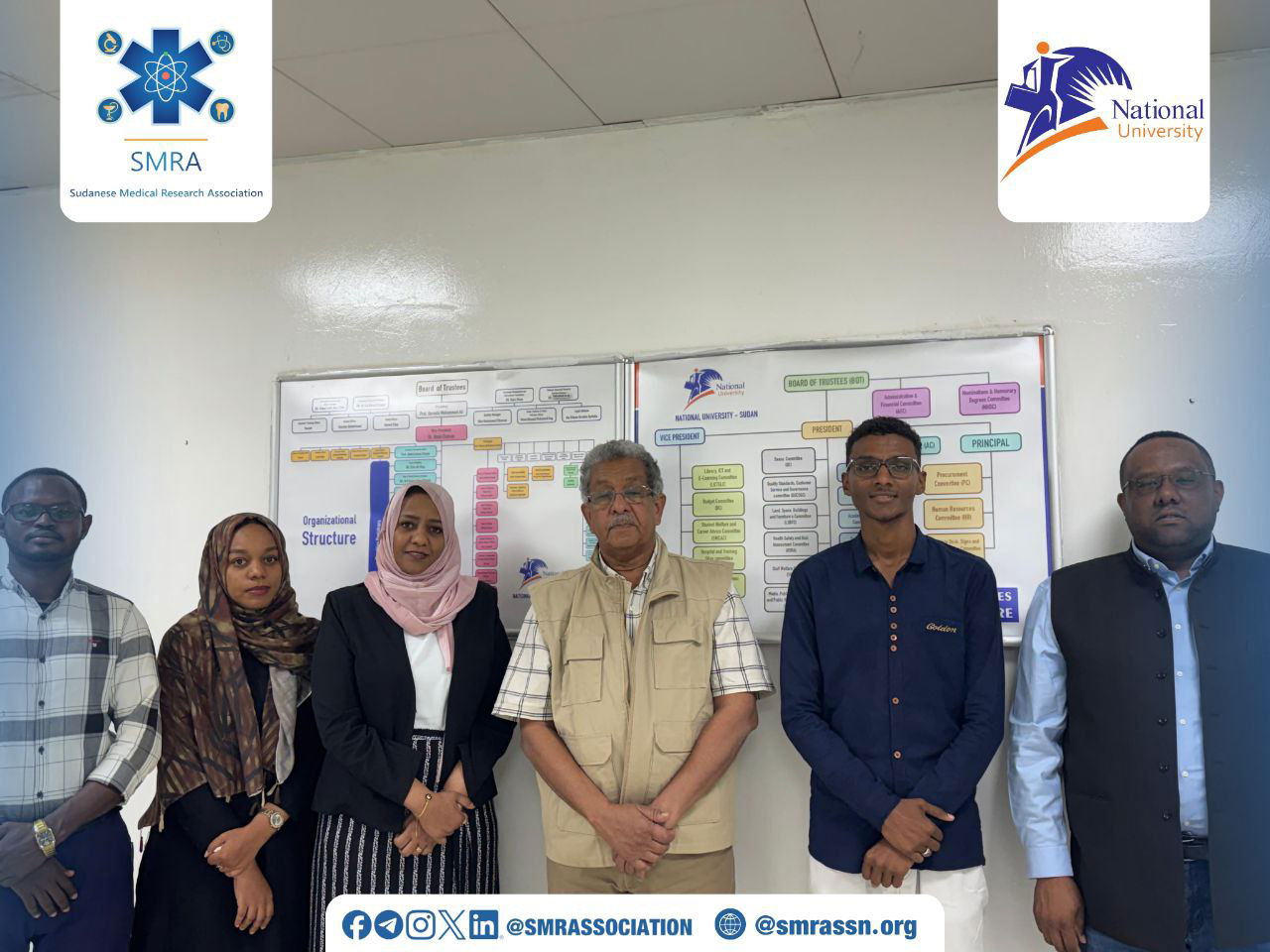 In a significant move toward advancing the national research landscape, the National University - Sudan, represented by its President, Professor Ahmed El-Fahal, and the Secretary of Academic Affairs, Dr. Eman Amin, accompanying them, the Deputy-Secretary of Academic Affairs, Dr. Ali Awadallah Ali, hosted a high-level delegation from the Sudanese Medical Research Association (SMRA) on Sunday morning.